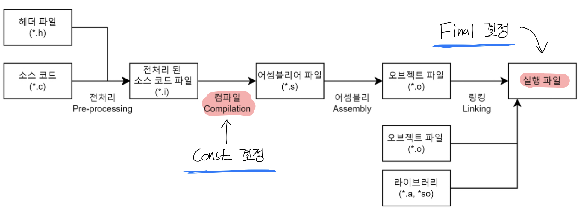 final은 파일이 컴파일된 후 실행될 때 값이 결정되지만, const는 컴파일 당시에 값이 결정된다.