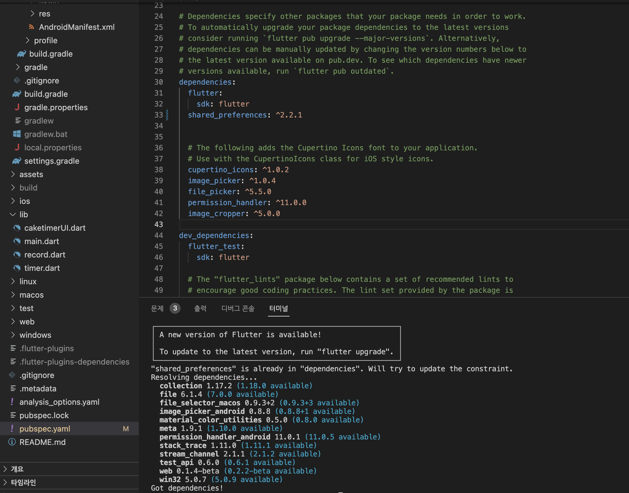 그리고 나서 아래와 같이 pubspec.yaml 파일의 dependencies 항목에 shared preferences가 추가되었는지 확인한다.